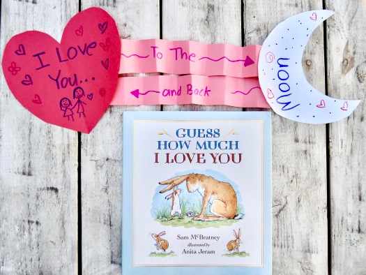 - Cut two vertical, long strips from the pink paper. Write “To the moon” with an arrow pointing to the right, on one strip. Then write “and back” with an arrow pointing to the left on the other strip.