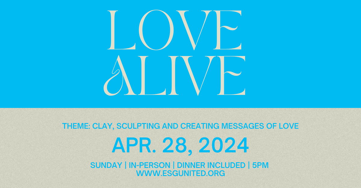 Join us on Sunday, April 28th in person at 5pm-7pm for Love aLIVE. The evening will include live worship, sharing dinner, and creating together. The focus of this Love aLIVE will be working with clay, sculpting, and creating messages of love. Rev. Sarah will lead a short exercise connecting the molding of clay to our spirituality. Participants will leave with a clay garland or creation of their choice. No previous sculpting experience is necessary!