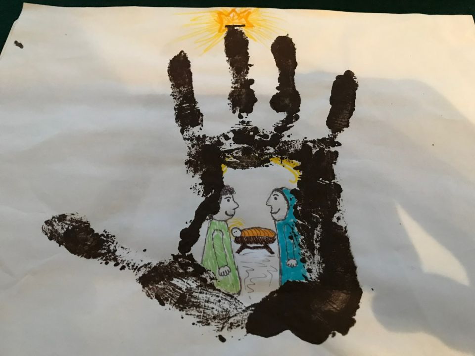 - Within the palm space on the paper draw Joseph, Mary and baby Jesus.